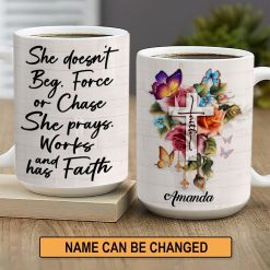 Gorgeous Personalized Flower And Cross White Ceramic Mug – She Prays, Works, And Has Faith NUH204A